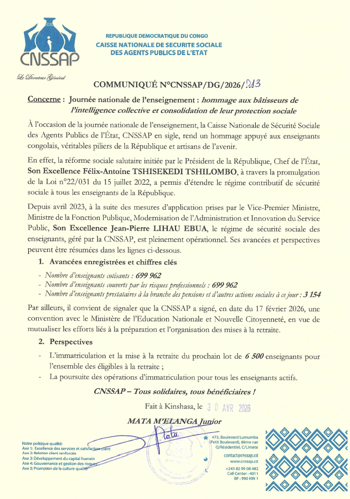En cette journée du 30 avril 2026 dédiée à ceux qui façonnent l’intelligence nationale, la CNSSAP réaffirme son engagement indéfectible à garantir aux enseignants congolais une protection sociale digne de leur noble mission, conformément à la vision sociale du Chef de l’État, Son Excellence Félix-Antoine TSHISEKEDI TSHILOMBO.